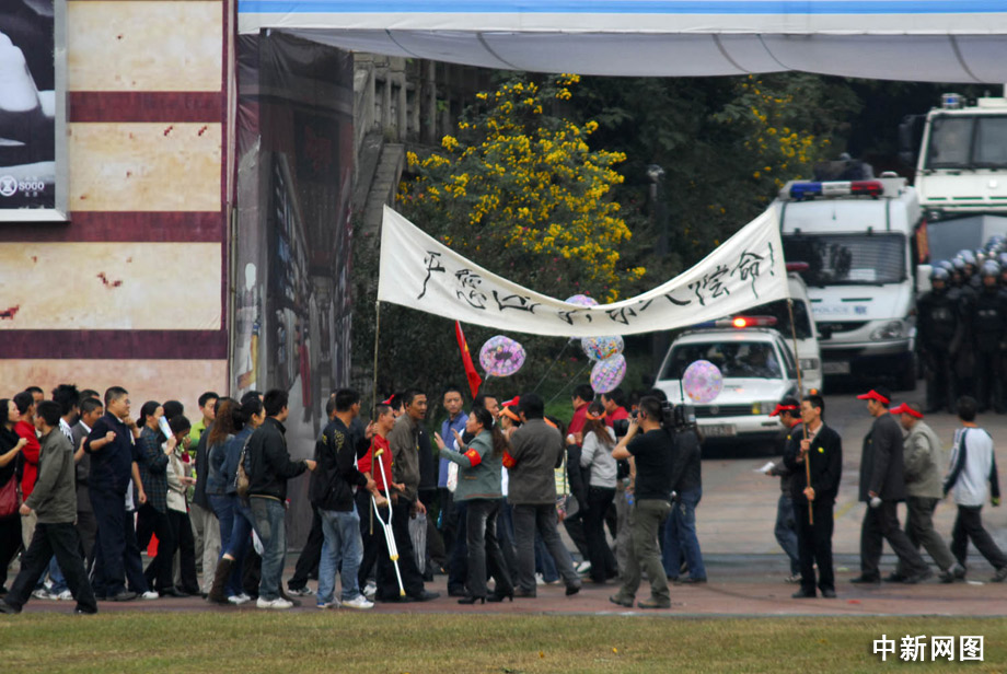 在演練現(xiàn)場,重慶發(fā)生“生化襲擊事件”,偵破工作正在進(jìn)行時,受害人家屬以賠償和嚴(yán)懲兇手為由進(jìn)行非法游行,堵塞交通和大型商場通道,擾亂交通秩序和正常經(jīng)營,引來大量群眾圍觀。 郝飛 攝