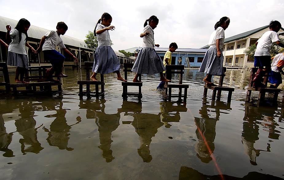 周二(20日)在菲律賓黎剎省,孩子們踩著椅子走過被洪水淹沒的學(xué)校操場。臺風(fēng)“盧碧”給飽受暴雨侵襲的菲律賓北部地區(qū)帶來更為強(qiáng)烈的降水。 來源:中國新聞網(wǎng)
