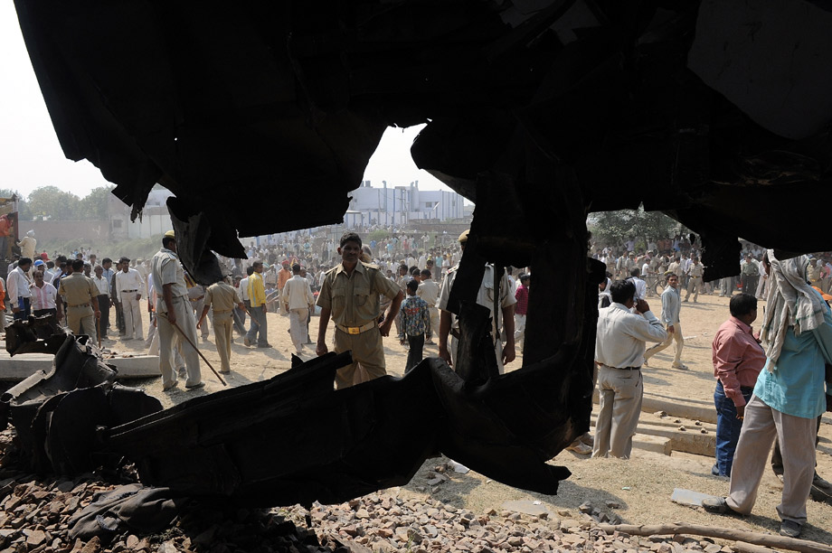 周三(21日)在距離印度首都新德里約80公里的馬圖拉,救援人員在火車相撞現(xiàn)場工作。當(dāng)日早晨,印度一列來自西南部果阿的快運(yùn)列車與一列來自西部梅瓦爾的快運(yùn)列車在此相撞,致使21人喪生、17人受傷。來源:來源:中國新聞網(wǎng)
