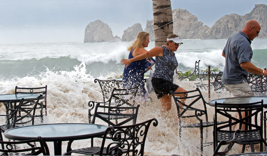 當(dāng)?shù)貢r(shí)間10月19日,墨西哥圣盧卡斯角,颶風(fēng)里克已經(jīng)在墨西哥沿海升級(jí)為10年來威力最強(qiáng)的颶風(fēng)。圖為游客被海邊的巨浪趕跑。