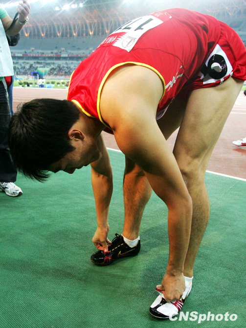 10月24日晚,全運會110米欄預(yù)賽在濟南奧體中心舉行,“飛人”劉翔以13秒75成績輕松晉級決賽。圖為在比賽結(jié)束后劉翔解開了鞋帶。 中新社發(fā) 富田 攝