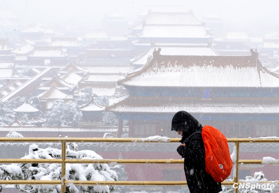 11月1日,深秋的北京大雪紛飛銀裝素裹,一名香港游客在北京景山上欣賞雪景。北京今年的初雪時間提前了整整一個月。中新社發(fā) 廖攀 攝