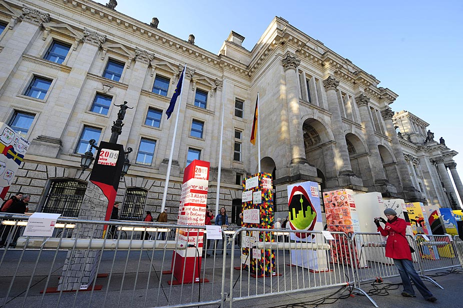 周五(6日),為了紀(jì)念柏林墻倒塌20周年,德國柏林的勃蘭登堡門附近擺放了一排墻體模型。來源:中國新聞網(wǎng)