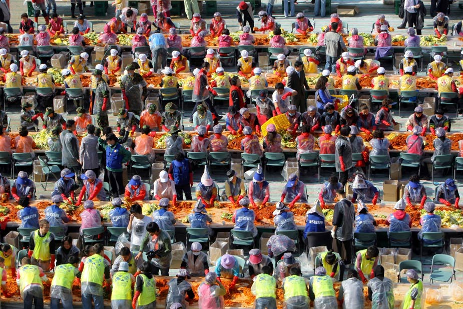 11月9日,約2700名韓國志愿者在首爾一所學(xué)校的操場上制作泡菜。