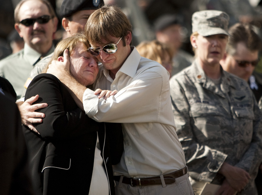 2009年11月10日,在美國得克薩斯州胡德堡陸軍基地,槍擊案遇害士兵的親屬參加悼念儀式。當(dāng)日,美國德克薩斯州胡德堡陸軍基地舉行儀式悼念槍擊案遇難者。 圖片來源:中國新聞網(wǎng)