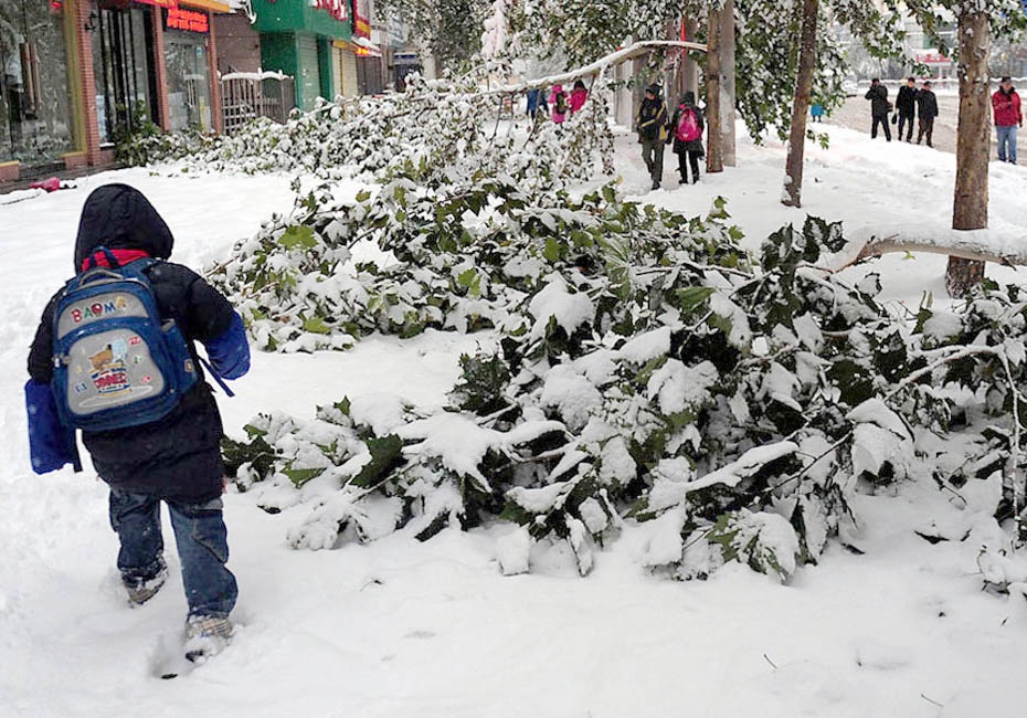 11月12日,一位上學的兒童從一棵被大雪壓倒的梧桐樹旁走過。 連日來,暴雪不斷襲擊鄭州。大雪給鄭州的交通和群眾生活造成了嚴重影響。 王頌 攝 (來源:新華網(wǎng))