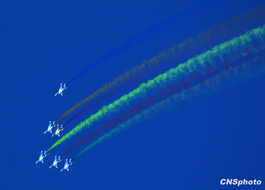 慶祝中國(guó)人民解放軍空軍成立60周年飛行表演,11月15日上午在北京沙河機(jī)場(chǎng)舉行。表演按八一飛行表演隊(duì)4架殲-10飛機(jī)表演12個(gè)動(dòng)作和6架殲-7GB飛機(jī)表演15個(gè)動(dòng)作,分四機(jī)對(duì)頭交叉、四機(jī)菱形隊(duì)大坡度盤旋、單機(jī)小速度平飛等27個(gè)動(dòng)作,其中四機(jī)對(duì)頭交叉動(dòng)作是這次表演中技術(shù)難度較大的動(dòng)作之一,這是國(guó)產(chǎn)三代飛機(jī)和國(guó)產(chǎn)二代飛機(jī)首次同場(chǎng)競(jìng)技表演。圖為殲-7GB進(jìn)行表演。中新社發(fā) 宋吉河 攝
