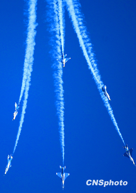 慶祝中國(guó)人民解放軍空軍成立60周年飛行表演,11月15日上午在北京沙河機(jī)場(chǎng)舉行。表演按八一飛行表演隊(duì)4架殲-10飛機(jī)表演12個(gè)動(dòng)作和6架殲-7GB飛機(jī)表演15個(gè)動(dòng)作,分四機(jī)對(duì)頭交叉、四機(jī)菱形隊(duì)大坡度盤旋、單機(jī)小速度平飛等27個(gè)動(dòng)作,其中四機(jī)對(duì)頭交叉動(dòng)作是這次表演中技術(shù)難度較大的動(dòng)作之一,這是國(guó)產(chǎn)三代飛機(jī)和國(guó)產(chǎn)二代飛機(jī)首次同場(chǎng)競(jìng)技表演。圖為殲-7GB表演六機(jī)向下開花。中新社發(fā) 宋吉河 攝