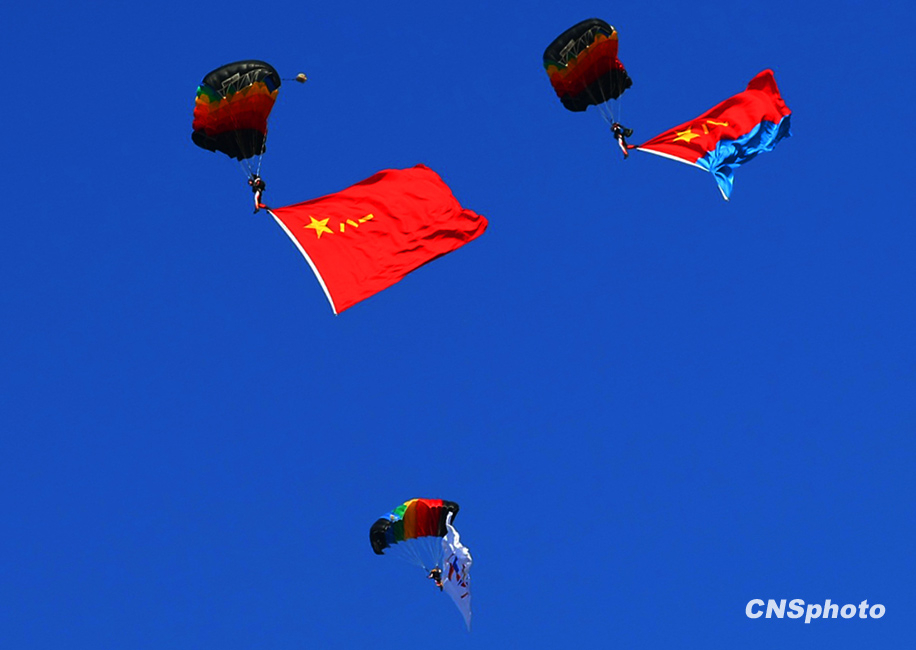 慶祝中國(guó)人民解放軍空軍成立60周年飛行表演,11月15日上午在北京沙河機(jī)場(chǎng)舉行。表演按八一飛行表演隊(duì)4架殲-10飛機(jī)表演12個(gè)動(dòng)作和6架殲-7GB飛機(jī)表演15個(gè)動(dòng)作,分四機(jī)對(duì)頭交叉、四機(jī)菱形隊(duì)大坡度盤旋、單機(jī)小速度平飛等27個(gè)動(dòng)作,其中四機(jī)對(duì)頭交叉動(dòng)作是這次表演中技術(shù)難度較大的動(dòng)作之一,這是國(guó)產(chǎn)三代飛機(jī)和國(guó)產(chǎn)二代飛機(jī)首次同場(chǎng)競(jìng)技表演?哲娞鴤氵\(yùn)動(dòng)大隊(duì)30名運(yùn)動(dòng)員表演了4個(gè)跳傘科目。中新社發(fā) 宋吉河 攝