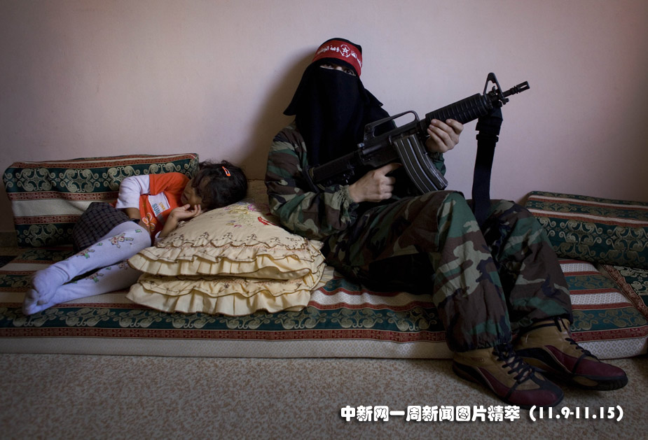 12日(周四),一名巴勒斯坦婦女在家中手拿槍支。圖片來源:中國新聞網(wǎng)
