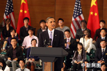 11月16日,正在上海訪問的美國總統(tǒng)奧巴馬現(xiàn)身位于浦東的上海科技館,與四百余中國青年進(jìn)行面對(duì)面交流。 圖片來源:中國新聞網(wǎng)