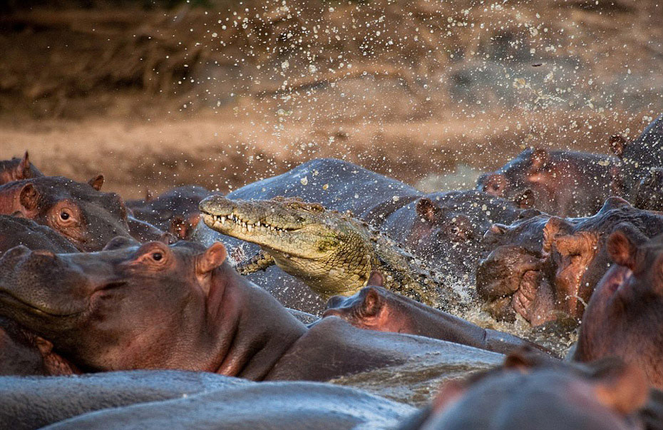 45歲的捷克野生動物攝影師Vaclav Silha日前在坦桑尼亞塞倫蓋蒂國家公園里拍攝到了非常令人震撼的場面。當(dāng)時,一條鱷魚悄悄混入了一群正在河里洗澡的河馬中,但由于與一頭帶著小河馬的河馬媽媽太過接近,它很快就被敏感的母河馬發(fā)現(xiàn)。憤怒的河馬們立刻對它發(fā)起了猛烈地攻擊,這條冒失的鱷魚很快死于非命。這組照片中的一張最早刊登于英國廣播公司(BBC)《野生動物》雜志的11月號。