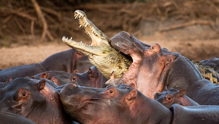 45歲的捷克野生動物攝影師Vaclav Silha日前在坦桑尼亞塞倫蓋蒂國家公園里拍攝到了非常令人震撼的場面。當(dāng)時,一條鱷魚悄悄混入了一群正在河里洗澡的河馬中,但由于與一頭帶著小河馬的河馬媽媽太過接近,它很快就被敏感的母河馬發(fā)現(xiàn)。憤怒的河馬們立刻對它發(fā)起了猛烈地攻擊,這條冒失的鱷魚很快死于非命。這組照片中的一張最早刊登于英國廣播公司(BBC)《野生動物》雜志的11月號。
