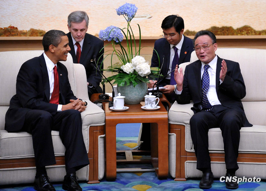 11月17日,中國(guó)全國(guó)人大常委會(huì)委員長(zhǎng)吳邦國(guó)在北京人民大會(huì)堂會(huì)見(jiàn)了美國(guó)總統(tǒng)奧巴馬一行。中新社發(fā) 廖攀 攝