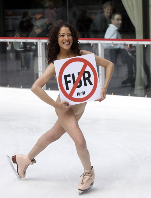 11月24日,美國(guó)花樣滑冰的傳奇人物、1979年世界花滑錦標(biāo)賽冠軍得主芭比洛尼在紐約洛克菲勒廣場(chǎng)復(fù)出“裸滑”。這次表演是為了支持善待動(dòng)物協(xié)會(huì)的反對(duì)皮草行動(dòng)。