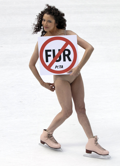11月24日,美國花樣滑冰的傳奇人物、1979年世界花滑錦標(biāo)賽冠軍得主芭比洛尼在紐約洛克菲勒廣場復(fù)出“裸滑”。這次表演是為了支持善待動物協(xié)會的反對皮草行動。