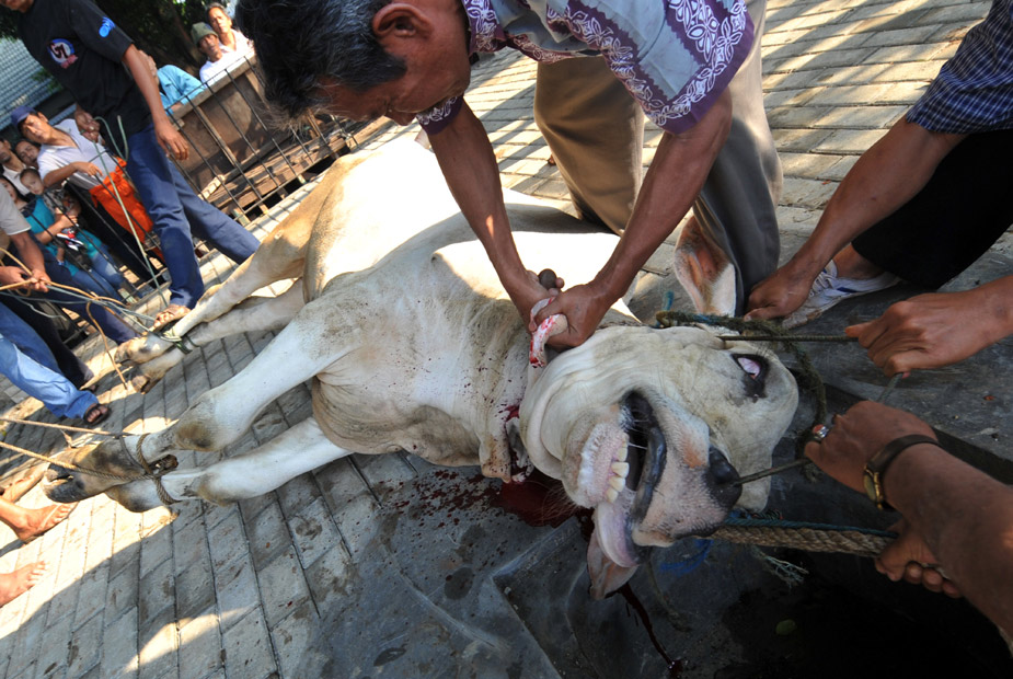 11月28日,世界各國的穆斯林迎來傳統(tǒng)節(jié)日“宰牲節(jié)”。圖為印度尼西亞的穆斯林在宰牲節(jié)上宰殺牲畜。