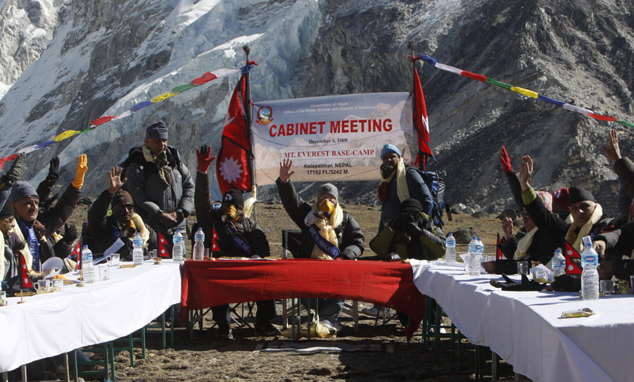 12月4日,尼泊爾總理和22位部長在喜馬拉雅山海拔5262米的高度舉行內(nèi)閣會議,討論全球變暖對喜馬拉雅山的影響。呼吁人們切實(shí)采取行動,保護(hù)環(huán)境。