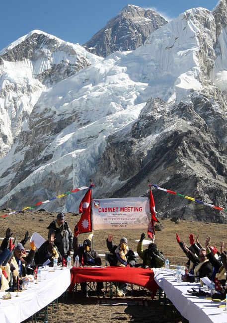 12月4日,尼泊爾總理和22位部長(zhǎng)在喜馬拉雅山海拔5262米的高度舉行內(nèi)閣會(huì)議,討論全球變暖對(duì)喜馬拉雅山的影響。