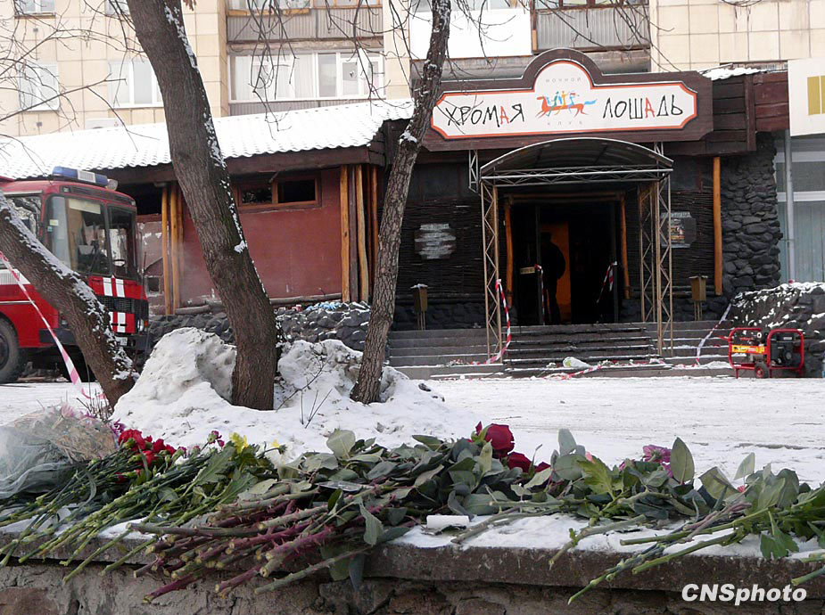 十二月六日,俄羅斯彼爾姆市民眾自發(fā)來到夜總會火災事故現(xiàn)場,悼念遇難者。圖中紅色建筑即為失火夜總會。中新社發(fā) 田冰 攝