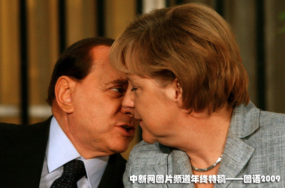 貝魯斯科尼與默克爾親密交談:2009年1月18日,以色列總理奧爾默特舉行記者發(fā)布會(huì)宣布停火時(shí),意大利總理貝盧斯科尼(左)和德國(guó)總理默克爾親密交談。