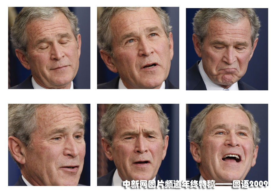 表情豐富的小布什:2009年1月12日,美國現(xiàn)任總統(tǒng)布什在白宮舉行告別記者會時的所作的喜怒哀樂表情。
