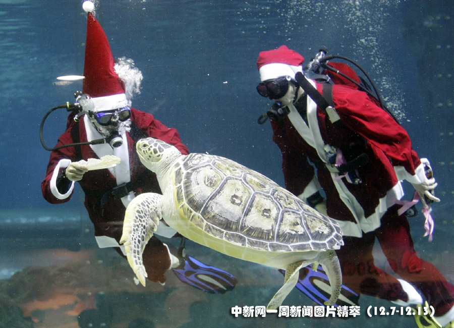 13日(周日),在韓國首爾的水族館,兩位飼養(yǎng)員身著圣誕老人的服飾在水中與海龜“同游”。圖片來源:中國新聞網(wǎng)