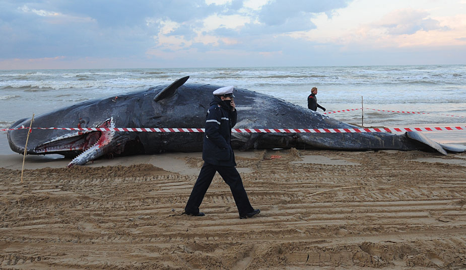 一群抹香鯨12月12日在意大利南部海灘擱淺,其中至少5頭已經(jīng)死亡。據(jù)稱,這群抹香鯨共有9頭,其中有2頭經(jīng)過救援已成功游回大海,目前相關(guān)人員對另外2頭正在進行救援。圖片來源:中國新聞網(wǎng)