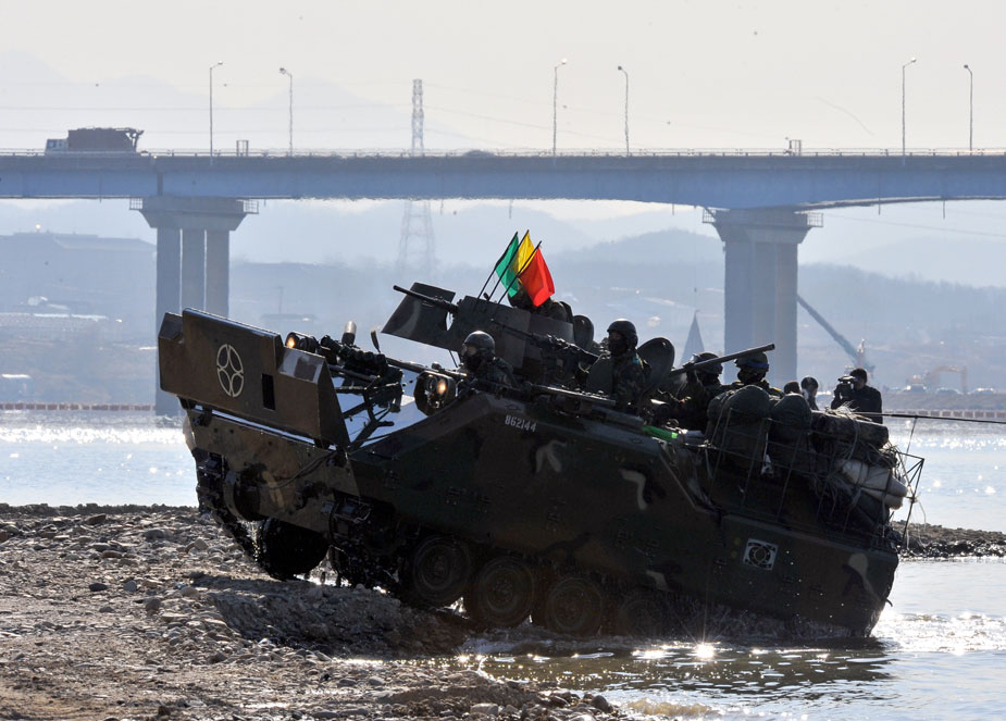 12月16日,韓國(guó)第20師團(tuán)機(jī)械化部隊(duì)在京畿道驪州南漢江一帶進(jìn)行大規(guī)模渡河實(shí)戰(zhàn)訓(xùn)練。該訓(xùn)練以培養(yǎng)戰(zhàn)斗執(zhí)行能力為重點(diǎn)。圖片來(lái)源:中國(guó)新聞網(wǎng)