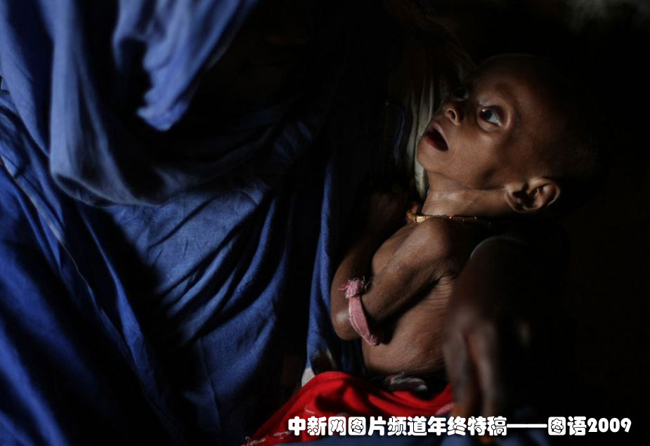 2009年7月11日,在索馬里首都摩加迪沙市郊的帳篷里,一個遭受嚴(yán)重營養(yǎng)不良的男孩緊緊依偎在他母親的懷里。