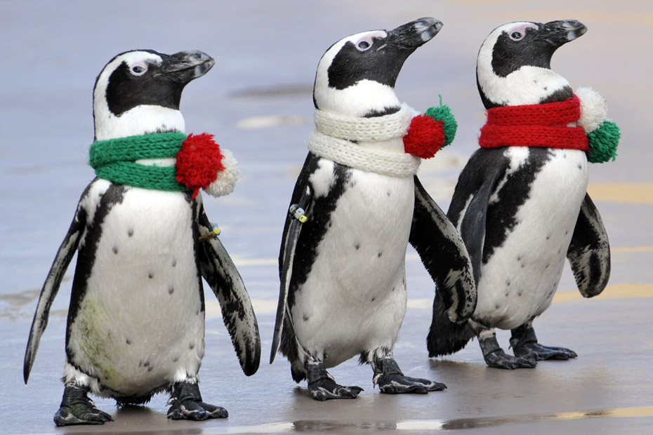 圖為東京橫濱八景島海洋樂(lè)園的企鵝披著圣誕圍巾在路邊行走。