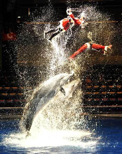圖為東京水族館內(nèi)工作人員身著圣誕老人服裝訓(xùn)練海豚。