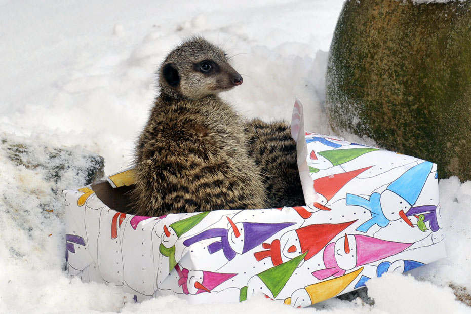 圖為德國北部城市漢諾威動(dòng)物園幾只收到了圣誕禮物的狐獴。