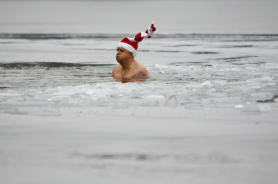 12月25日,德國柏林的冬泳俱樂部“柏林海豹”(Berliner Seehunde)的成員不畏寒冬,光著身子在已經(jīng)結(jié)冰的Oranke湖中暢游一番。圖片來源:中國新聞網(wǎng)