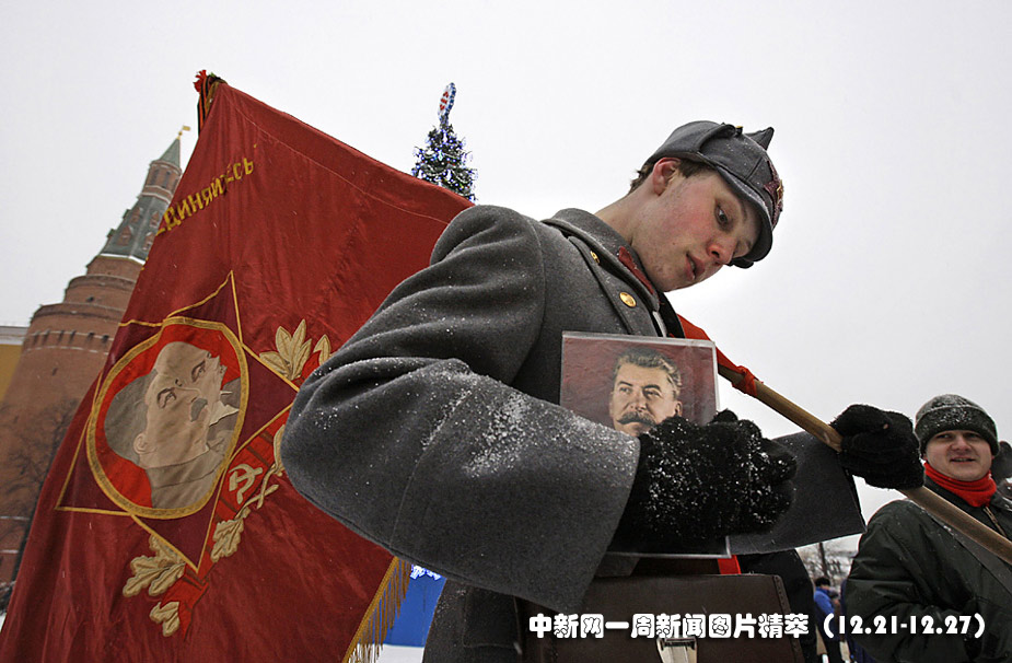 21日(周一),一名俄羅斯士兵手持斯大林肖像,等著向莫斯科紅場上的斯大林墓敬獻鮮花,以紀念這位前蘇聯(lián)領(lǐng)導(dǎo)人130周年誕辰。