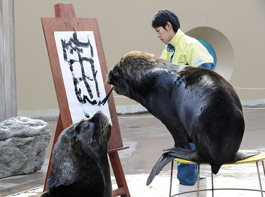 12月30日,日本神奈川八景島海洋樂園水族館內(nèi),海獅表演了用毛筆在紙上“寫”漢字的節(jié)目。圖片來源:中國新聞網(wǎng)