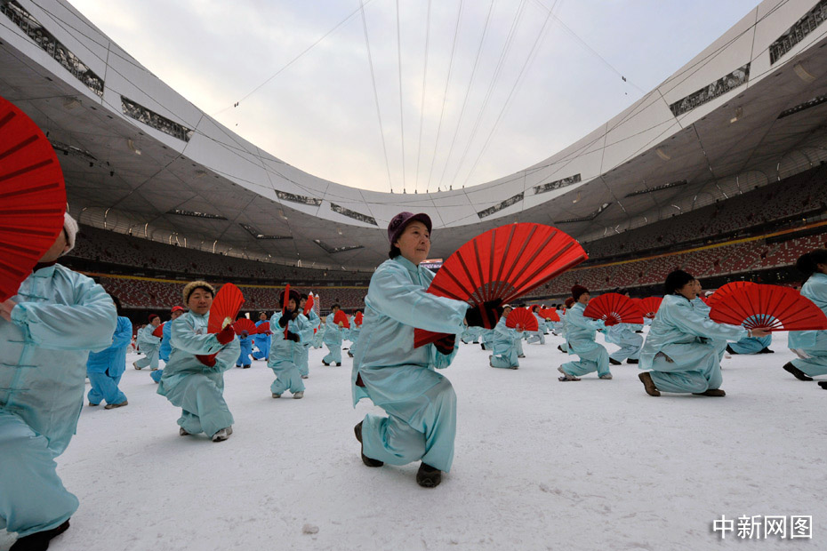 2010年1月1日上午,2010人在被冰雪覆蓋的鳥巢內表演了太極拳、武功扇等民族傳統(tǒng)健身項目。中新網(wǎng)記者 金碩 攝