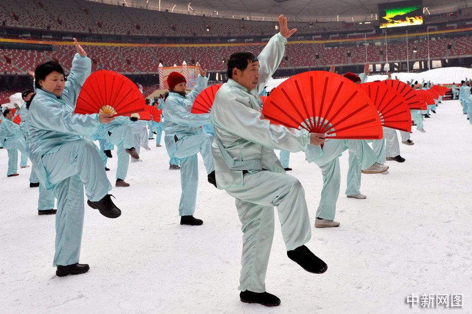 2010年1月1日上午,2010人在被冰雪覆蓋的鳥(niǎo)巢內(nèi)表演了太極拳、武功扇等民族傳統(tǒng)健身項(xiàng)目。中新網(wǎng)記者 金碩 攝