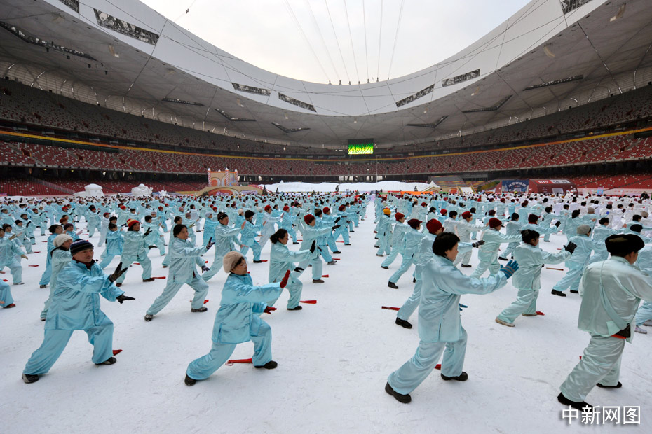 2010年1月1日上午,2010人在被冰雪覆蓋的鳥巢內(nèi)表演了太極拳、武功扇等民族傳統(tǒng)健身項(xiàng)目。中新網(wǎng)記者 金碩 攝