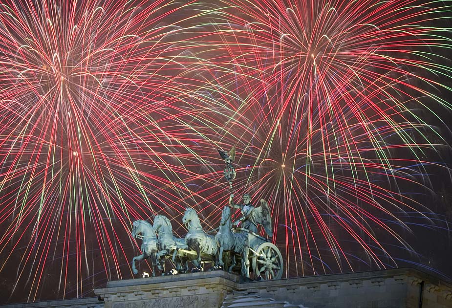 圖為2010年1月1日,焰火在德國(guó)柏林勃蘭登堡門上空綻放,慶祝新年的到來(lái)。