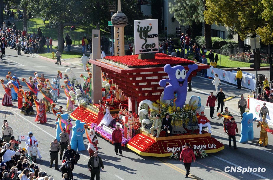 美國當(dāng)?shù)貢r間1月1日,第121屆美國玫瑰花車大游行在加州帕薩迪納市隆重舉行。著名影星成龍助陣中國上海世博花車。圖片來源:中國新聞網(wǎng)