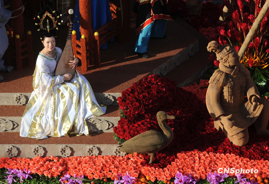 美國當(dāng)?shù)貢r間1月1日,第121屆美國玫瑰花車大游行在加州帕薩迪納市隆重舉行。著名影星成龍助陣中國上海世博花車。圖片來源:中國新聞網(wǎng)