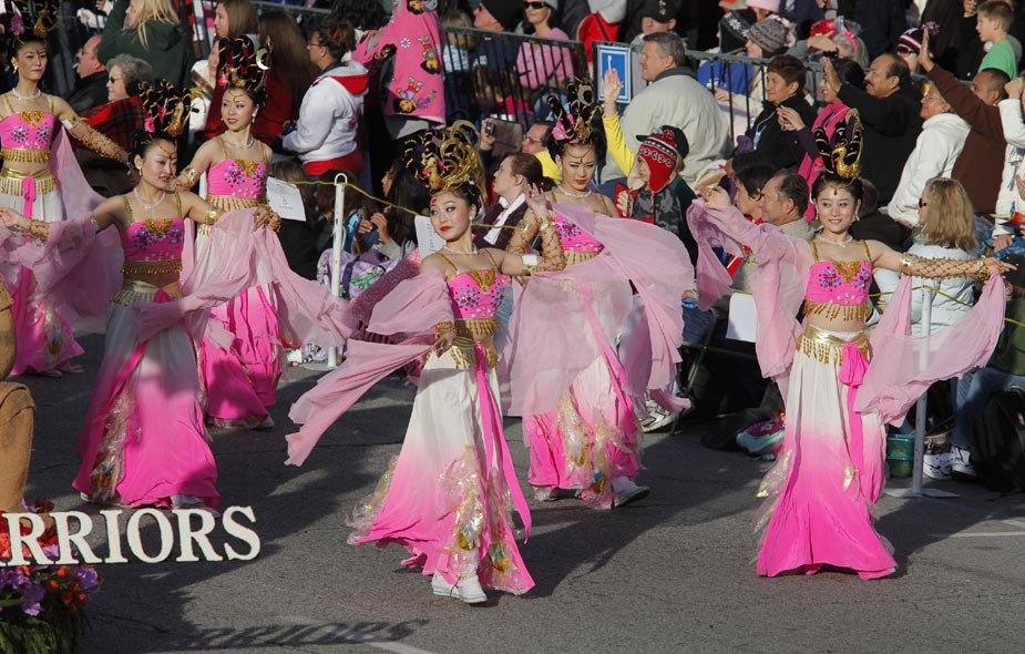 美國當(dāng)?shù)貢r間1月1日,第121屆美國玫瑰花車大游行在加州帕薩迪納市隆重舉行。著名影星成龍助陣中國上海世博花車。圖片來源:中國新聞網(wǎng)
