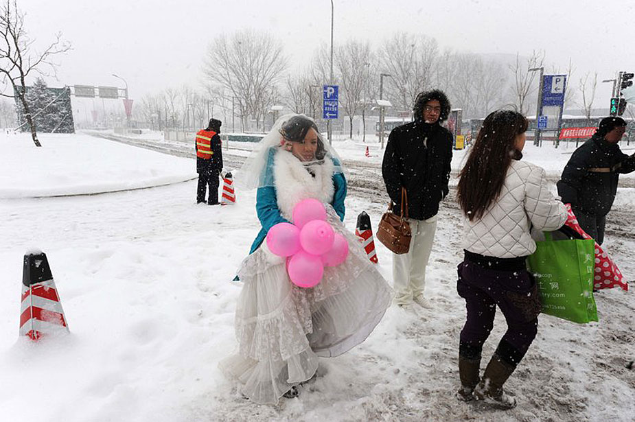 鳥(niǎo)巢邊的馬路,一對(duì)新人剛在大雪紛飛中拍完婚紗在路邊等車。周民/CFP