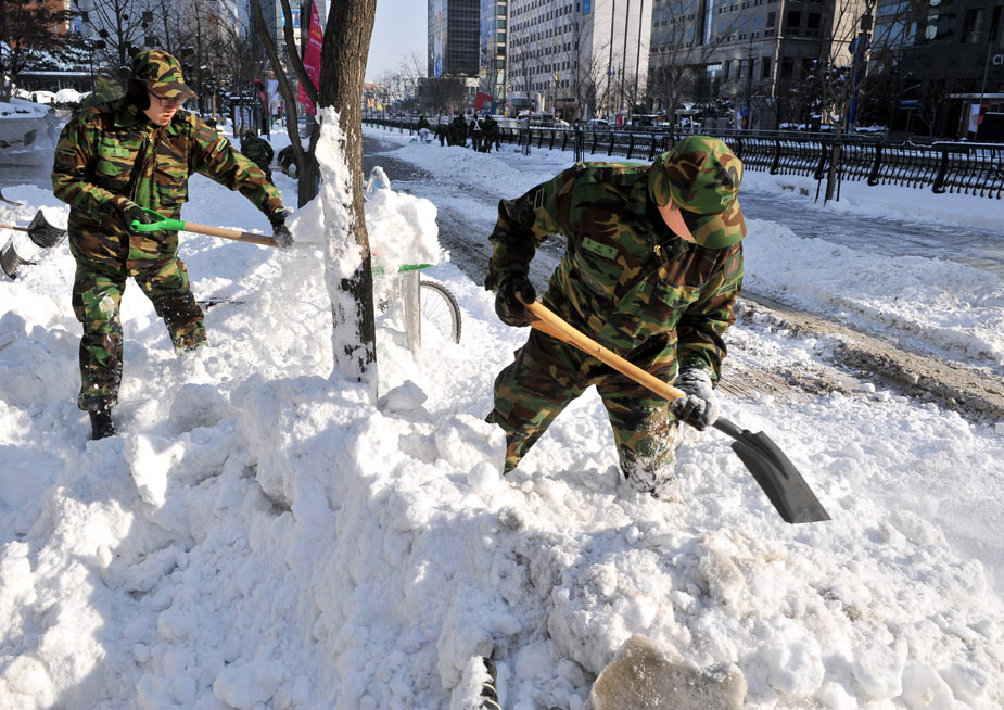 四日,韓國大部分地區(qū)遭遇大雪。至下午二時左右,首爾地區(qū)積雪厚度超過二十八厘米,這是韓國自一九三七年開始進(jìn)行積雪量觀測以來的最新紀(jì)錄。圖為1月5日,韓國士兵在街頭除雪。