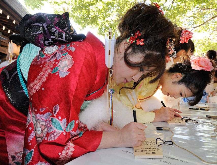 今年的1月11日,是日本傳統(tǒng)的成人節(jié),所有滿20歲的年輕人將宣告自己邁進了成人行列。1月8日,日本一家公司年滿20歲的年輕女孩紛紛穿上和服,到廟宇中祈福,提前慶祝成人節(jié)的到來。