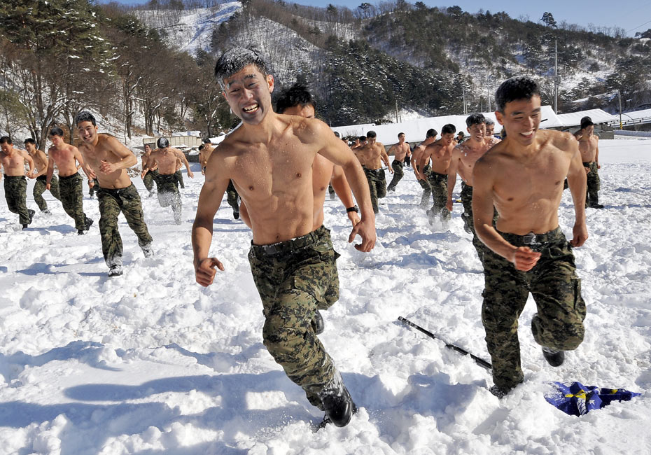 2010年1月8日,韓國(guó)特種部隊(duì)在首爾以東約180公里的雪地上進(jìn)行了冬季實(shí)地演練,官兵們赤膊上陣鍛煉耐寒能力。圖片來(lái)源:中國(guó)新聞網(wǎng)