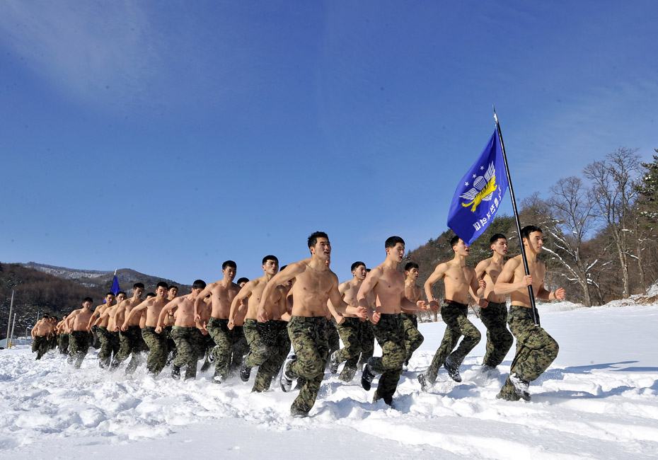 2010年1月8日,韓國(guó)特種部隊(duì)在首爾以東約180公里的雪地上進(jìn)行了冬季實(shí)地演練,官兵們赤膊上陣鍛煉耐寒能力。圖片來(lái)源:中國(guó)新聞網(wǎng)