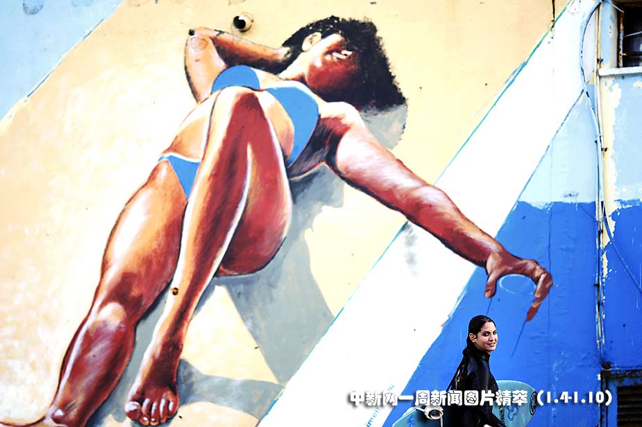 1月4日,(周一)在特拉維夫,一名女孩在地中海沖浪后走過(guò)一幅壁畫。當(dāng)日海浪最高達(dá)8英尺。圖片來(lái)源:中國(guó)新聞網(wǎng)