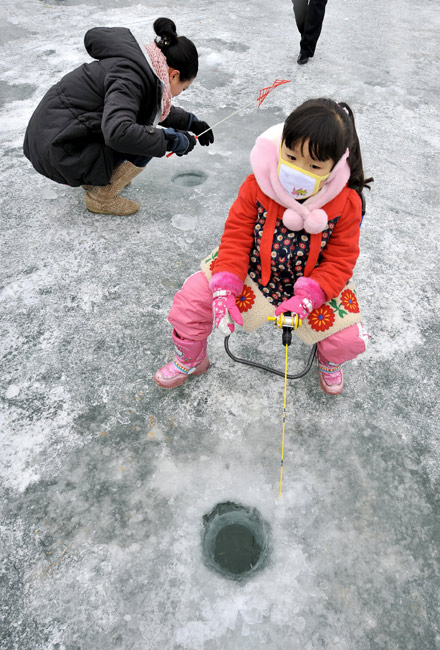 2010年1月9日,韓國(guó)華川郡,一年一度的華川山鱒魚節(jié)當(dāng)日舉行。數(shù)千游客在此“破冰”比賽釣鱘魚。該活動(dòng)每年都會(huì)吸引上百萬(wàn)游客前來(lái)。
